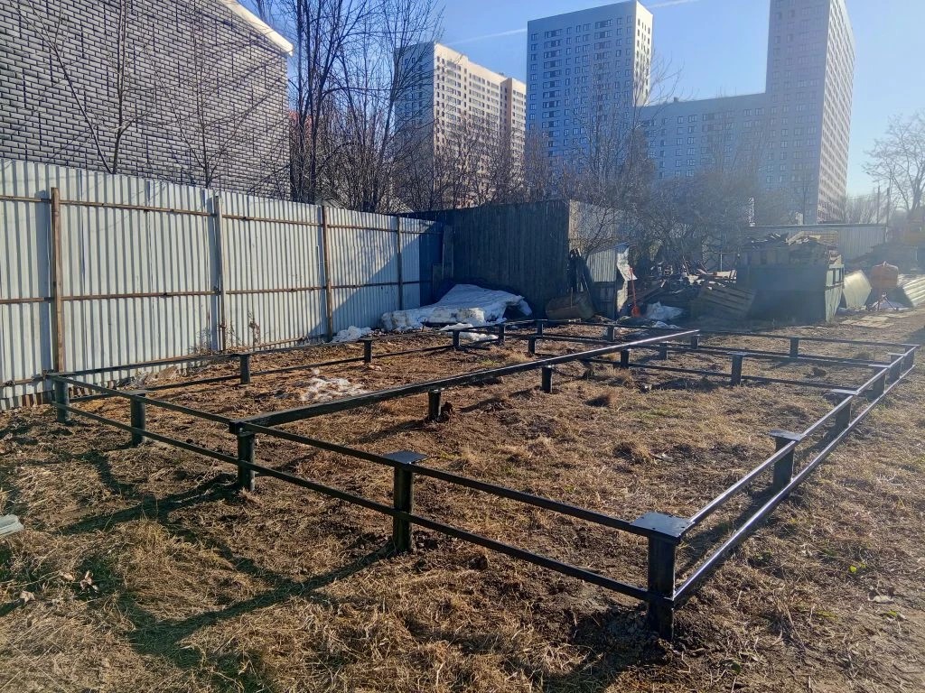 —Смонтировали 24 винтовые сваи с обвязкой профтрубой 20х40 для строительства дома 6х8м из оцилиндрованного бревна