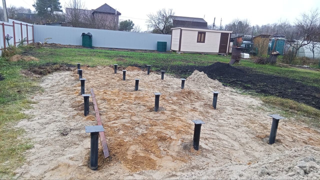 Мы использовали сваи диаметром 89 мм – это "золотой стандарт" для подобных легких, но ответственных построек, обеспечивающий превосходную несущую способность. Длина свай в 2.5 метра была выбрана не случайно: это позволяет заглубить сваю значительно ниже уровня промерзания грунта в Московской области. Такое решение гарантирует, что фундамент не будет "гулять" и деформироваться под воздействием морозного пучения, сохраняя баню в идеальном состоянии на долгие годы.